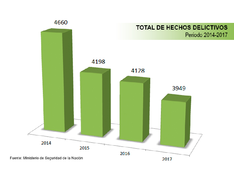 En cuanto al índice de delitos totales, Río Negro bajó la tasa de hechos de 4.660 por cada 100.000 habitantes en 2014 a 3.949 en 2017, lo que representa una caída del 15,25%.