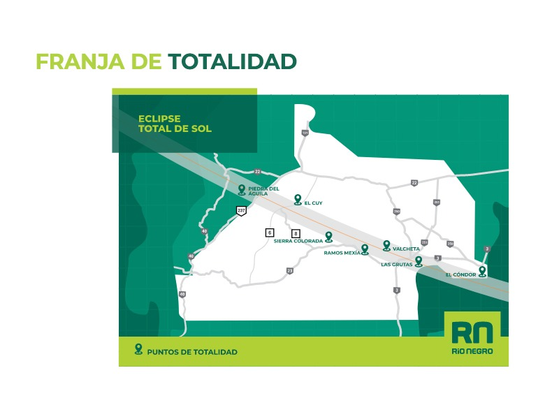 El evento comenzará a las 11.48 en el extremo Noroeste de la provincia. El Cuy será la primera localidad alcanzada por el fenómeno. El punto de totalidad será a las 13.12 y se estima que dure 1m23s.