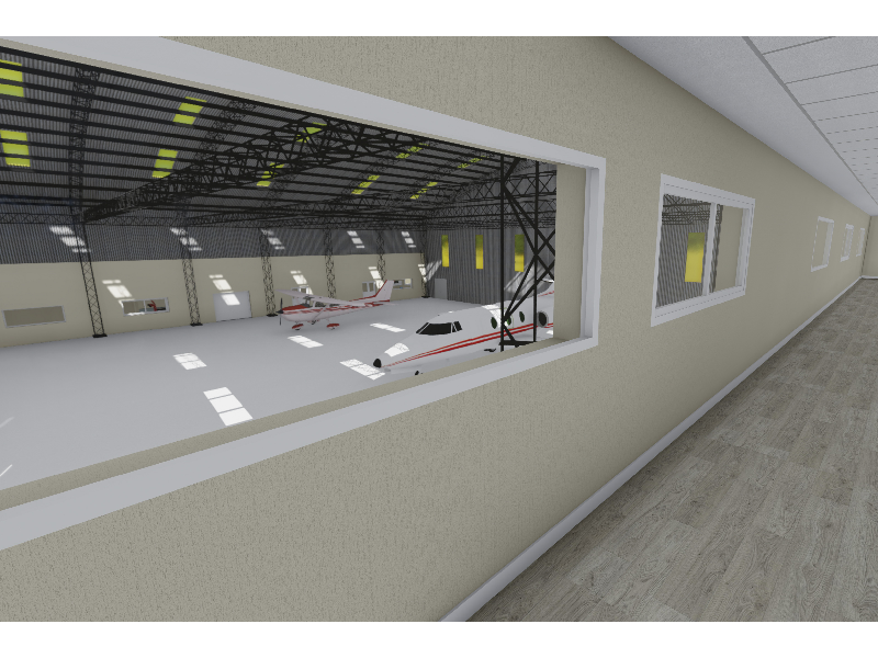 Asimismo, se realizarán tareas generales en los rubros de terminaciones en los diferentes locales de acuerdo a uso y funciones y se reemplazarán en su totalidad las carpinterías en fachada, generando una nueva imagen del edificio en concordancia a la escala de intervención en el interior, y modificando el portón de acceso de las aeronaves para permitir el ingreso de las de mayor porte.
